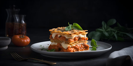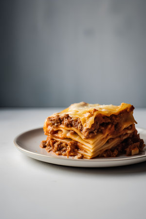 AI Generated. Delicious layered lasagna served on a white plate with rich sauce and melted cheese