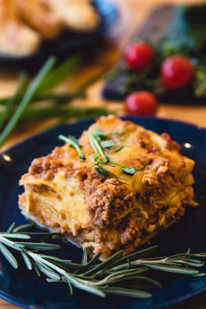 Homemade lasagna on a rustic wooden table. Selective focus.