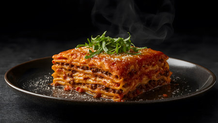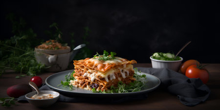 Delicious lasagna with meat sauce and cheese on dark background, hd photography of food, delicious bolognese pasta in the style of seihebricommerce stock photo contest winner. High quality photo