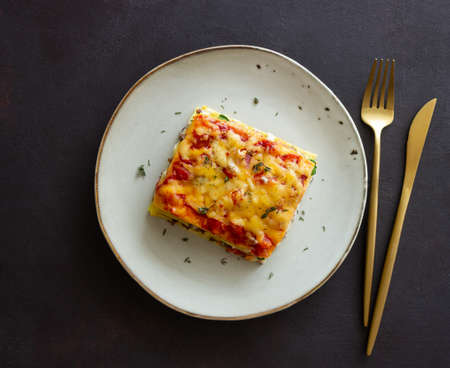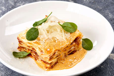 Piece of tasty hot lasagna served on a plate. Italian cuisine, menu, recipe. Homemade meat lasagna.