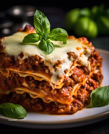 A mouthwatering image of a lasagna, perfectly layered with rich meat sauce, cheese, and fresh basil.