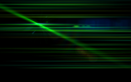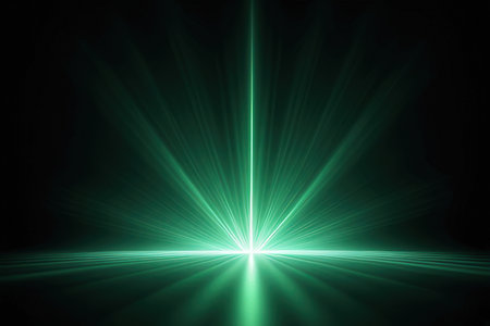 Bright green neon laser lights illuminate the darkness creating lines and triangle shapes in sci-fi effect.