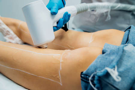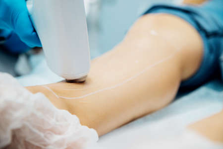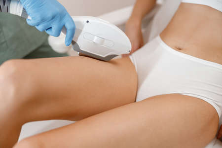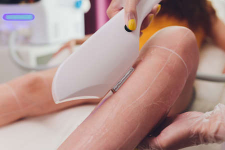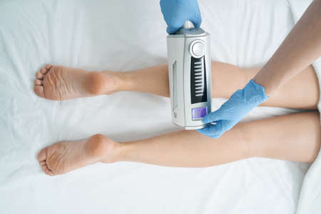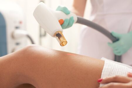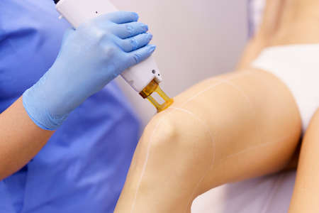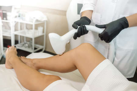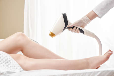 Laser hair removal, photoepilation, body and skin care concept. Young woman remove hair on legs at cosmetology clinic.