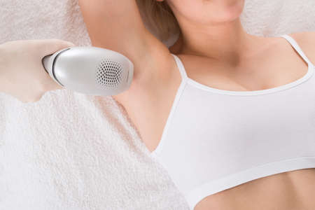 Modern home photoepilator in female hands. Remove unwanted hair.