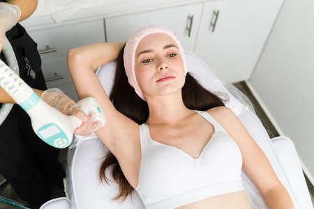 Laser epilation and cosmetology in beauty salon. Laser hair removal. Woman during laser hair removal procedure. Applying conductive gel. Armpit epilation.
