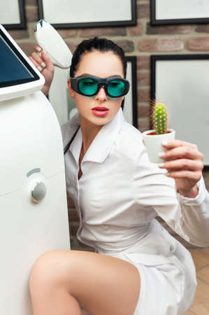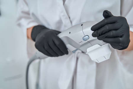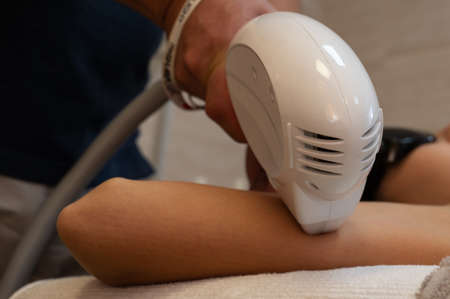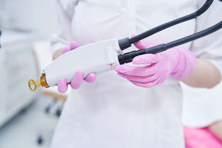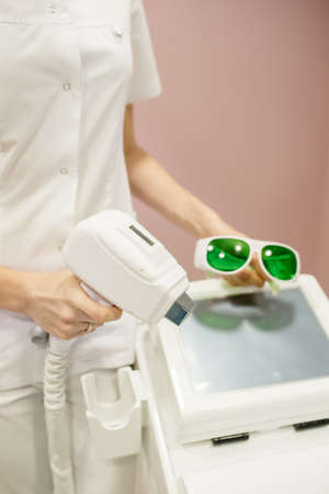 Laser device for removing unwanted hair in the hand of nurse. Laser hair removal, cosmetic body treatments. Concept of hygiene, beauty, health. Girl holding a working part of the epilator in her hand