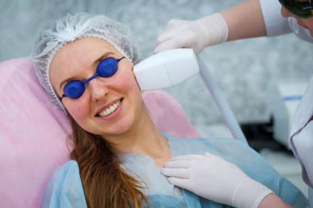 Laser hair removal and cosmetology in a beauty salon. Hair removal procedure. Laser hair removal, cosmetology, spa and hair removal concept. Beautiful young caucasian woman on procedure