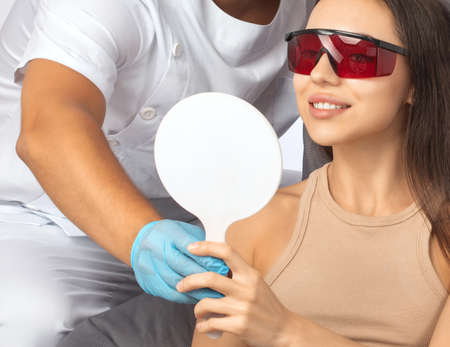 Master carries out removal moustache of unwanted hair laser on face young woman. Health and beauty concept