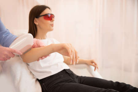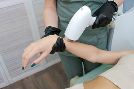 Close up Laser removal of dark hair from hands of young woman. Concept Epilation Skin care.