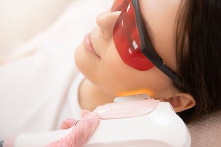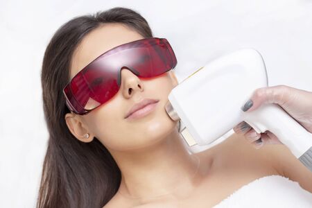 procedure of photoepilation in the beauty salon. Young Woman Receiving Epilation Laser Treatment On Face At Beauty Center Close Up