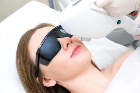 Anti-aging procedures. Skin care concept. Woman receiving facial beauty treatment, removing pigmentation at cosmetic clinic. Intense pulsed light therapy. IPL. Rejuvenation, photo facial therapy.