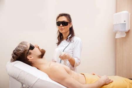 Female worker depilates hair of man on chest with laser machine in spa salon