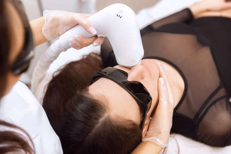 Master carries out removal of unwanted hair laser on face young woman in medical center. Upper lip hair removal. Health and beauty concept