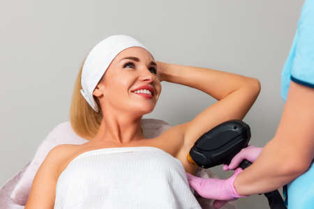 Laser epilation and cosmetology in beauty salon. Hair removal procedure. Laser epilation, cosmetology, spa, and hair removal concept. Beautiful blonde woman getting hair removing on underarm