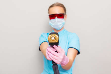 Portrait of a woman cosmetologist wearing protective glasses holding a laser device. gray background. The concept of laser surgery and hair removal.