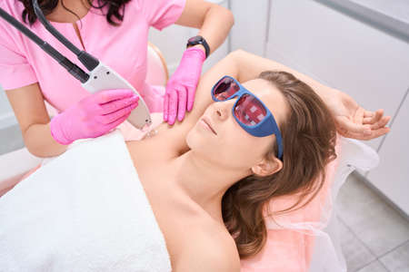Caucasian woman in protective eyeglasses at laser hair removal procedure in beauty salon. Beautician does an epilation on armpits. Concept of professional cosmetology.