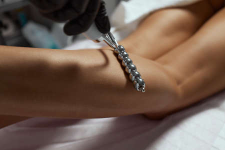 Top view of a caucasian woman with smooth skin at the beauty parlor receiving a radio frequency procedure