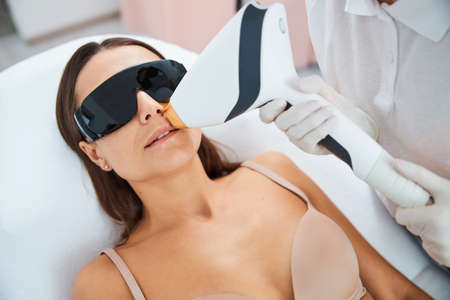 Young woman wearing dark glasses while lying on the medical couch and beautician holding laser device above her forehead