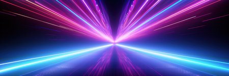 Abstract neon light trails converging towards a central point