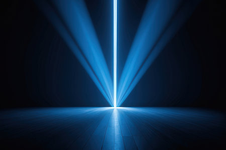 A striking image of a bright blue laser beam projecting intricate light patterns across a dark wall. This artwork captures the interplay of light and shadow.