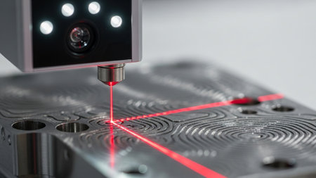 A close-up view of a laser cutter applying a focused beam to a metallic surface, creating intricate designs.