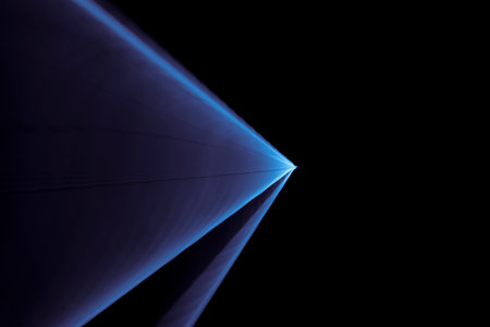 A striking image of a bright blue laser beam projecting intricate light patterns across a dark wall. This artwork captures the interplay of light and shadow.