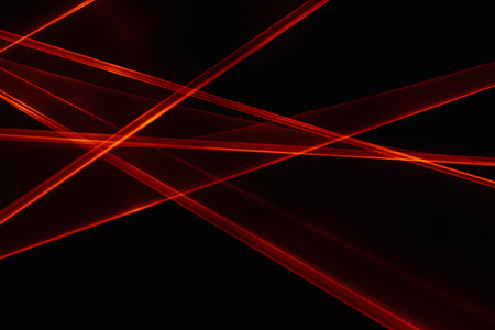 A polished metal device projects three intense crimson beams that intersect dramatically on a glossy, shadowed surface, creating a captivating play of light and dark.