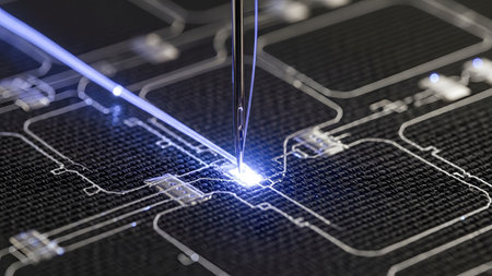 A sewing needle pierces dark textured fabric, connecting glowing blue lines forming circuit...
