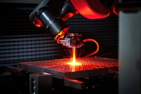 A high-tech laser machine operates in a modern workshop, producing sparks as it engages with metal surfaces. Dynamic lighting enhances the innovative atmosphere.