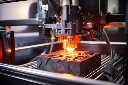 Modern engineering excellence in high-precision mechanical component printing under neon lights. concept of advanced manufacturing, futuristic innovation, precision technology, industrial design.