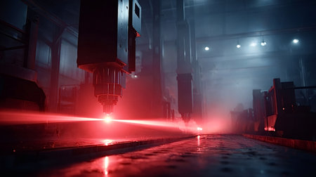 Powerful industrial laser cutter processing metal sheet in modern factory, generating intense red light and smoke, showcasing advanced manufacturing technology