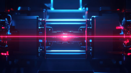 Explore a stunning representation of futuristic laser technology with vibrant neon lights and intricate machinery, perfect for themes of innovation and science.