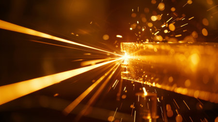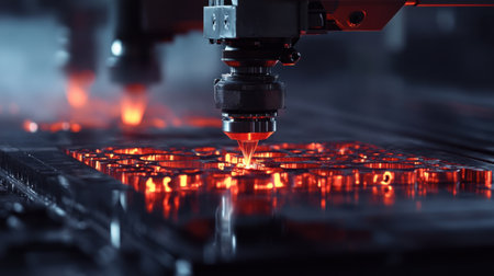 An industrial laser precisely cuts a metal plate, emitting bright orange light. The close-up shot reveals the intricate process, with focus on the precision of the laser. The metallic surface reflects the light, creating a dynamic composition suitable for illustrating technology and industrial applications.