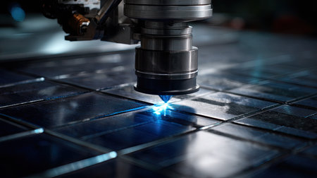 A close-up view of advanced laser technology focused on solar panel production, showcasing precision machinery in action for innovative energy solutions.