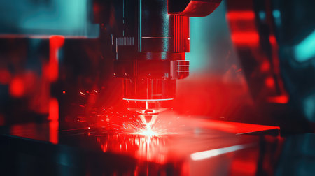 A close-up view of an industrial laser cutting machine operating on metal, emitting sparks. the precise and controlled process highlights modern manufacturing and engineering concepts in a workshop or factory setting. Generative AI