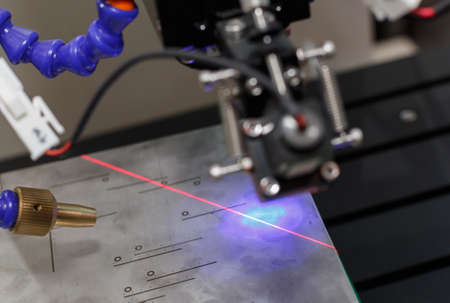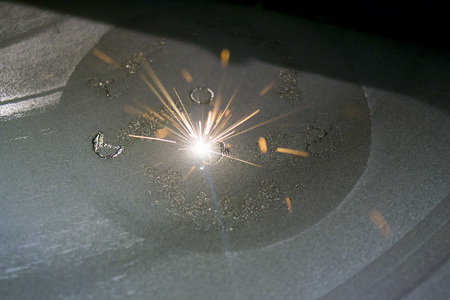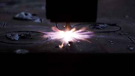 Laser CNC cutting of metal with light spark, modern industrial technology. Blue color steel tool