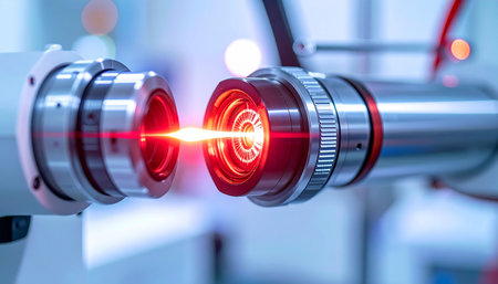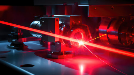 A concentrated beam of red light cuts through the space between two high-tech components, showcasing the pinnacle of modern industrial manufacturing. This is the heart of precision engineering, where power and accuracy converge to shape the future of technology.