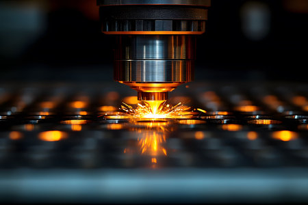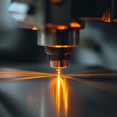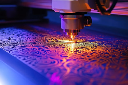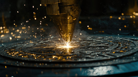 A close-up view of a laser cutter applying a focused beam to a metallic surface, creating intricate designs.