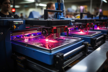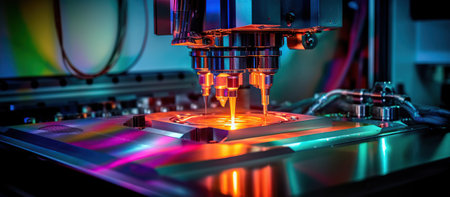 High-Tech Laser Equipment Processing Electronic Components in a Futuristic Laboratory Setting with Colorful Lighting Effects