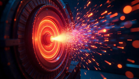 Bright sparks and glowing light erupt from metal cutting, showing intense energy in an industrial setting.