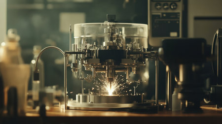 An intricate machine sits in a laboratory, emitting sparks as it operates. This image captures the spirit of innovation and technological advancement in modern engineering practices.