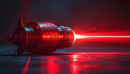 This image showcases advanced laser technology in action, highlighting a focused beam of red light on a surface. Perfect for tech and engineering projects.