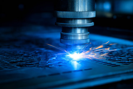 A close-up view of a high-tech laser cutting machine in operation, showcasing precision and innovation in metal fabrication with glowing sparks.