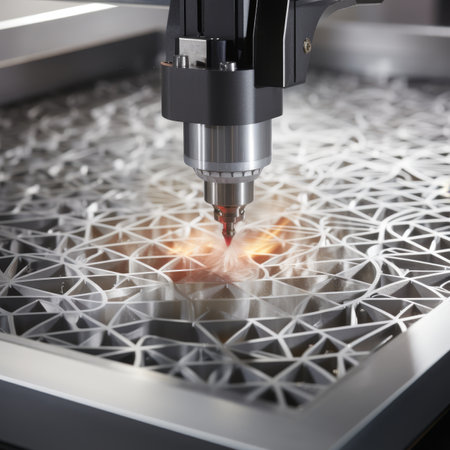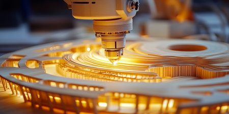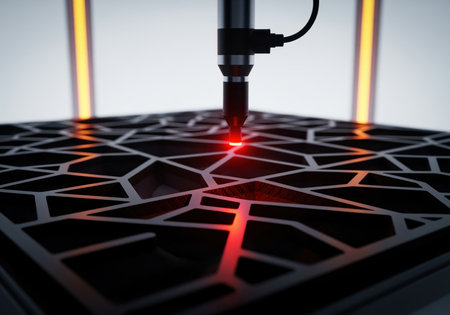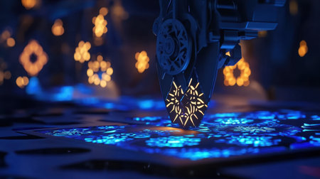 Closeup of high-tech laser manufacturing with intricate patterns and glowing engraving process