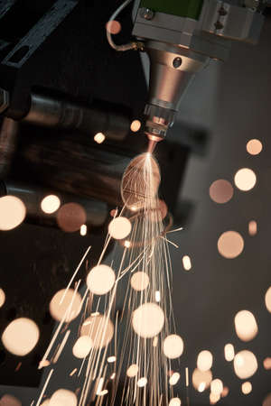 Laser cutting machine with sparks. Laser cutting of metal. Metalworking.