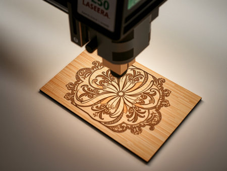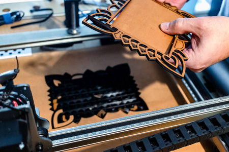A skilled craftsman uses a laser cutter to engrave beautiful wooden patterns.