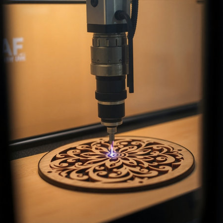 A skilled artisan operates a laser cutter to meticulously engrave a detailed wood panel. Vibrant sparks fly as designs take shape in a contemporary workshop filled with creative energy.