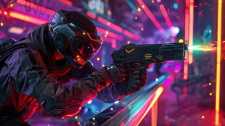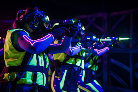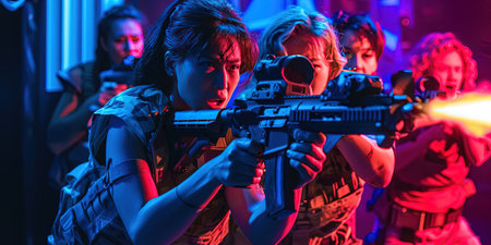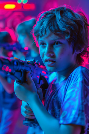 Kids activities. Playing laser tag, neon colors. High quality photo