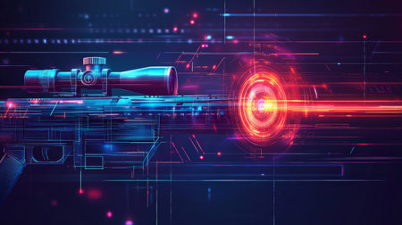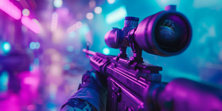 A striking view of a sniper rifle in a vibrant neon-lit environment, symbolizing action and adventure.