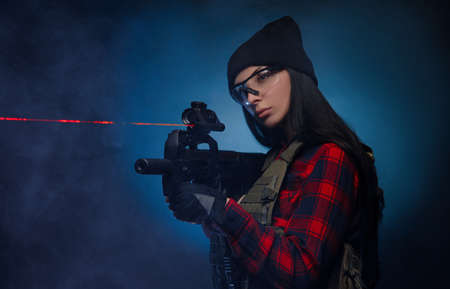 Futuristic girl soldier with a gun in the smoke on the dark background.
